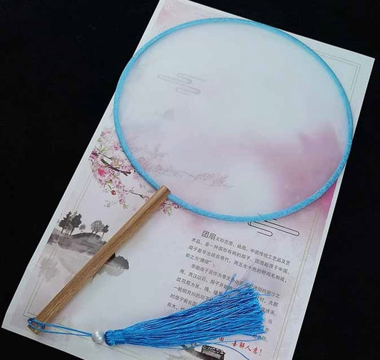 DIY Silk Fan – Blank Shujian Painting Surface │ 21 cm Round, 15 cm Wooden Handle │ Colorful Tassel │ Traditional Chinese Craft