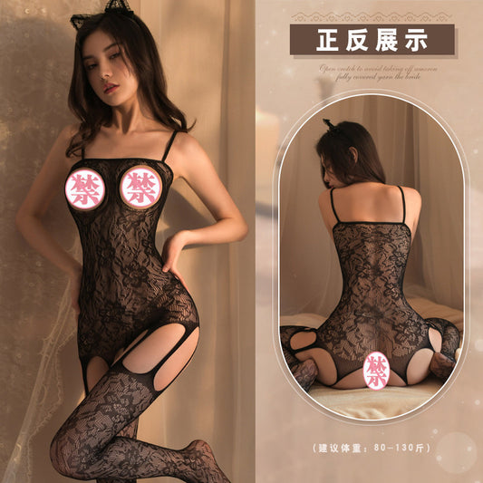 Sheer Hollow-Out Fishnet Bodystocking, Open-Crotch Nightdress, Erotic Uniform Set