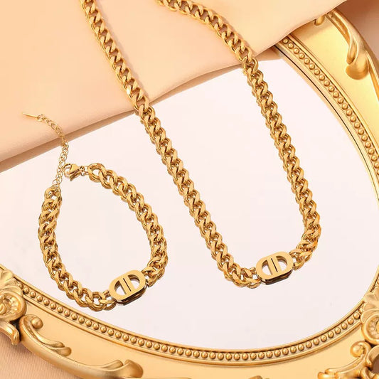 18K Gold-Plated Double D Titanium Steel Cuban Chain Set – Hip-Hop Style Necklace & Bracelet for Men & Women (Non-Tarnish)