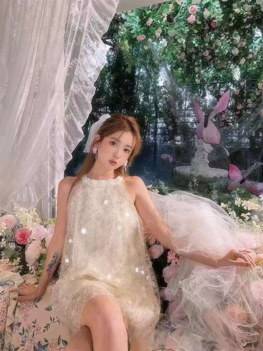 Apricot Sequin Pearl Hanging Neck Dress