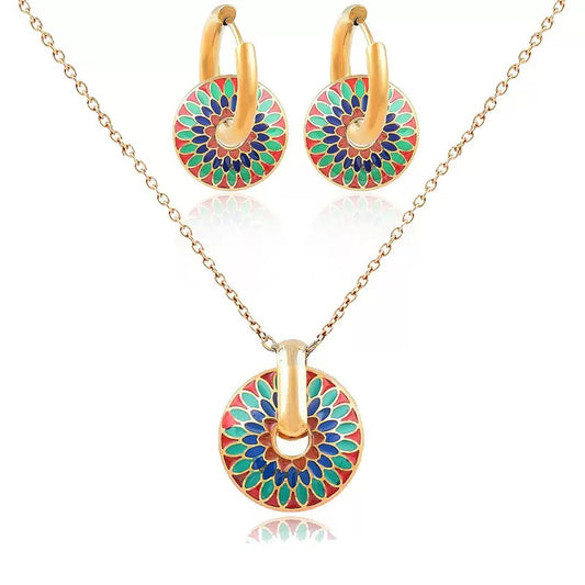 Retro Enamel Jewelry Set – Colorful Drop Glaze Hoop Earrings & Pendant Necklace (2-Piece Set)