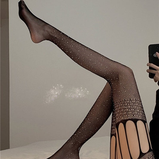 Sexy Black Fishnet Stockings with Rhinestones, Hollow Mesh, Suspender Design, Summer Pure Desire Full Body Tights