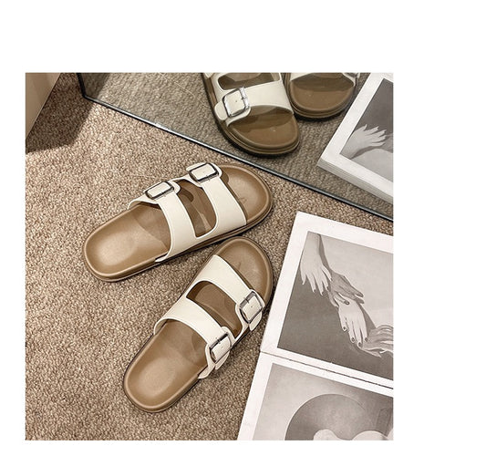 Women’s Double Strap Buckle Slides – Cream & Olive