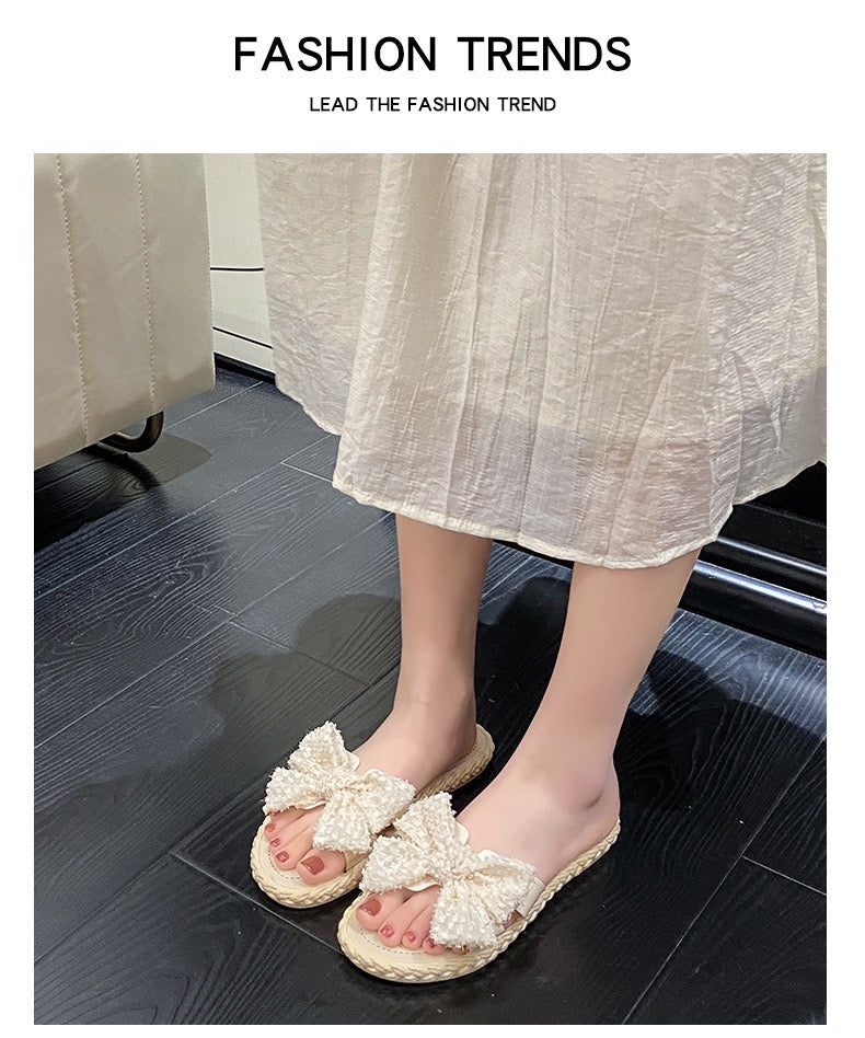 - Sweet, summery, and full of charm—these fuzzy bow slides are the perfect pair to brighten up your warm-weather wardrobe. With a soft, textured bow on top and handwoven jute-style soles, they’re lightweight, comfy, and endlessly cute.